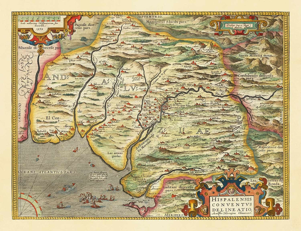Mapa antiguo de Andalucía, Sevilla, España por Ortelius en 1573: Sevilla, Huelva, Cádiz, Barrameda, Santa María, Real