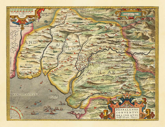 Un mapa de Abraham Ortelius, deliciosamente característico y extremadamente raro, de la suroeste de España, Andalucía, centrado en la ciudad de Sevilla. El mapa fue publicado originalmente en 1573 como parte del Theatrum Orbis Terrarum, el primer atlas moderno del mundo.