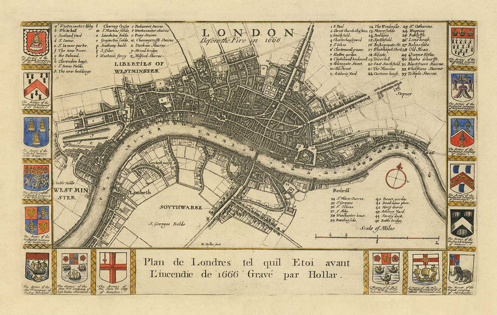 Un mapa de plano de la ciudad de Londres antes de la catástrofe de 1666. El Gran Incendio de Londres, que comenzó en una panadería en Pudding Lane, se extendió por la ciudad y destruyó más de 13,000 casas y la antigua Catedral de San Pablo. Debido a las propiedades construidas de manera cercana y la madera utilizada para construir hogares, el fuego se propagó rápidamente, durando cinco días y destruyendo el 80% de Londres.