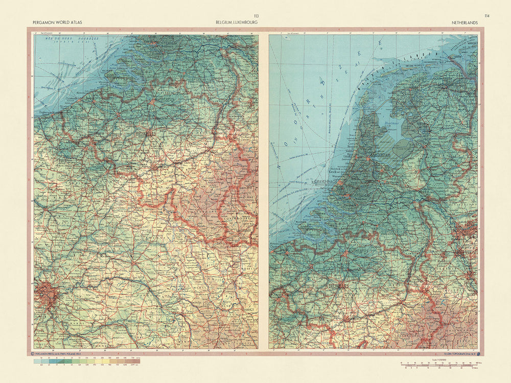 El estilo del mapa es político y físico detallado, presentando una representación exhaustiva de los límites políticos y características físicas de estas naciones. El mapa delimita meticulosamente las fronteras de provincias, distritos y ciudades, mientras también muestra el paisaje natural. Montañas, ríos y otros fenómenos naturales significativos están representados con precisión, proporcionando una comprensión completa de la geografía física de estas naciones. El estilo del mapa, por lo tanto, sirve como una ventana al pasado, permitiendo a los espectadores comprender el contexto geográfico y político de Bélgica, Luxemburgo y los Países Bajos a mediados del siglo XX.
