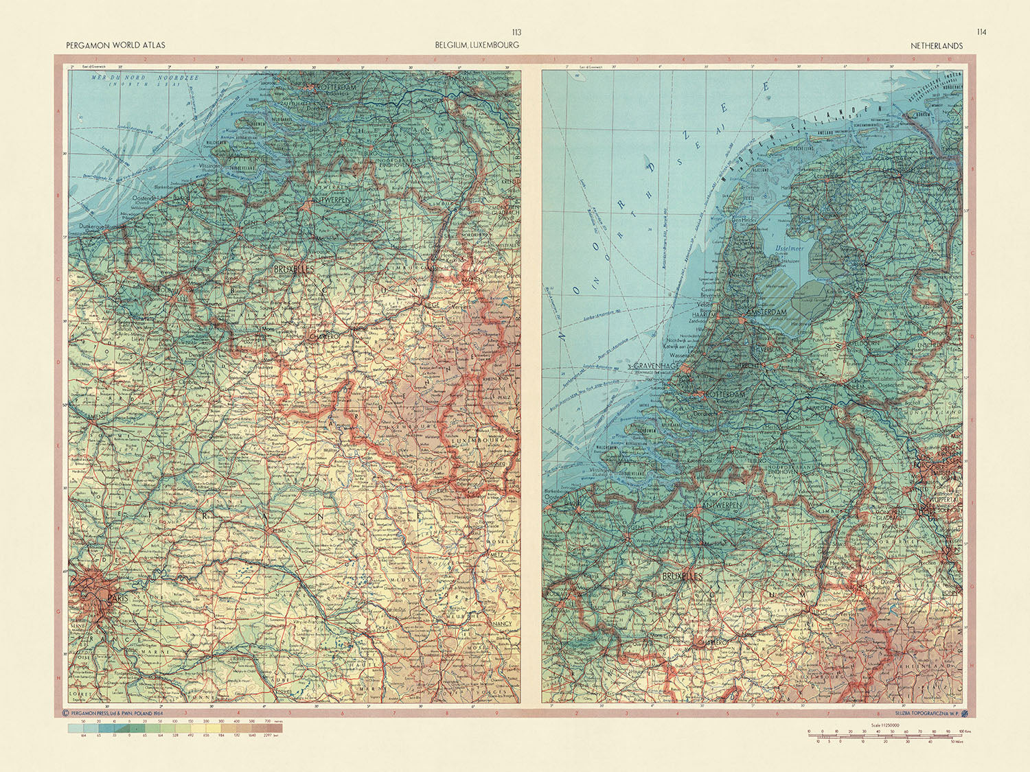 El mapa 'Bélgica, Luxemburgo, Países Bajos' del Servicio de Topografía del Ejército Polaco en 1967 abarca una amplia gama de características geográficas e históricas. Aquí hay algunos de los elementos significativos representados en el mapa, categorizados por país: