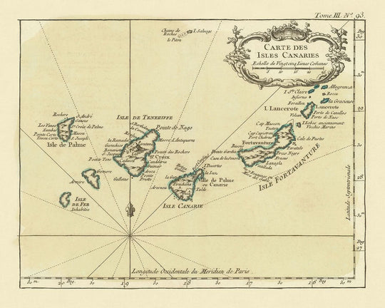 El mapa de Bellin ofrece una visión fascinante de la geografía de las Islas Canarias, destacando islas clave como Gran Canaria, Tenerife y Palma. El mapa está adornado con elementos náuticos, incluidas rosas de los vientos y líneas loxodrómicas, que subrayan su propósito principal como herramienta de navegación. Estas características no solo se suman al atractivo estético del mapa, sino que también sirven como testimonio de la destreza marítima de la época, cuando las islas eran un centro estratégico para exploradores y comerciantes.