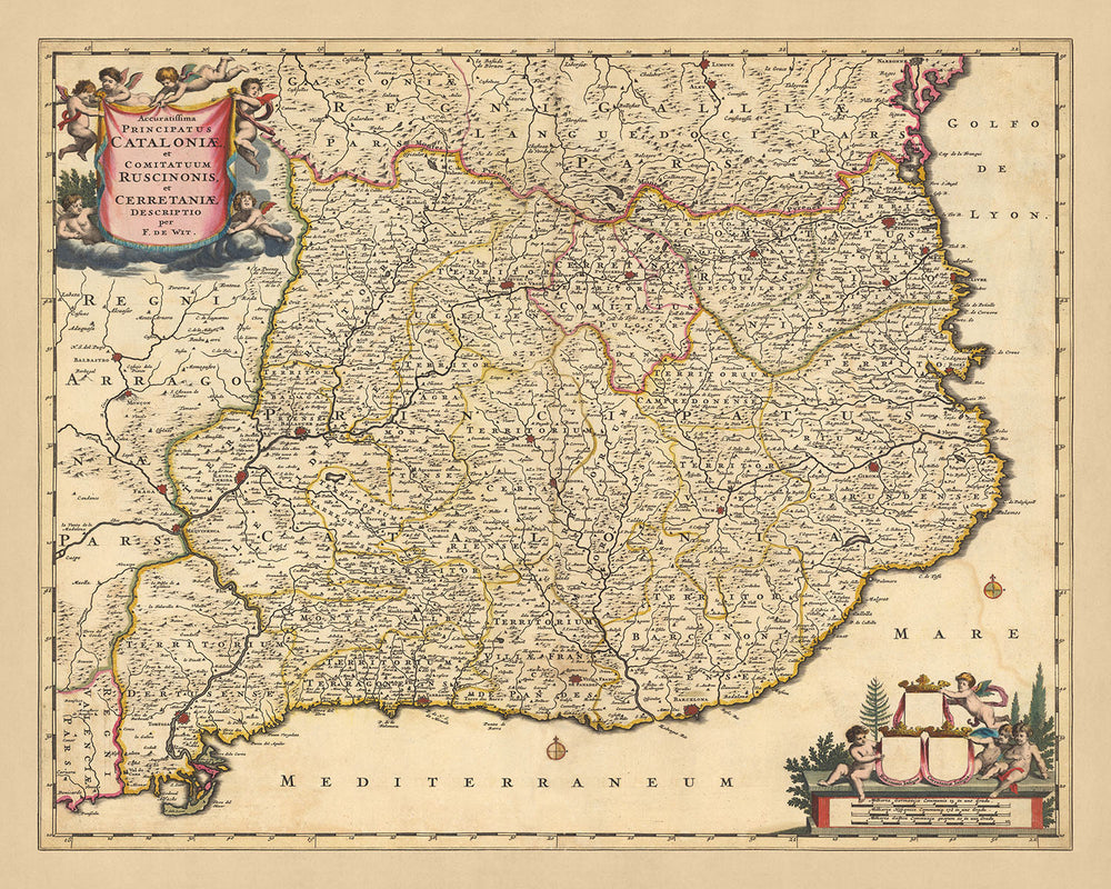 Sumérgete en la rica historia y la intrincada geografía del 'Accuratissima principatus Catalunyae et comitatuum Ruscinonis, et Cerretaniae descriptio', un mapa cautivador elaborado por Nicolaes Visscher II en 1690. Traducido al inglés, el título del mapa dice: 'La descripción más precisa de el Principado de Cataluña y los Condados del Rosellón y de la Cerdaña». Al explorar este mapa meticulosamente detallado, se sentirá transportado a finales del siglo XVII, cuando Cataluña era un principado próspero dentro del área más grande que ahora se conoce como España.