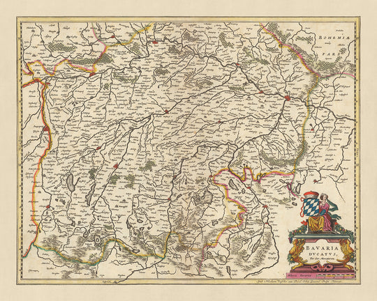 Adéntrese en la rica historia del Ducado de Baviera con este mapa meticulosamente elaborado por Nicolaes Visscher II, un renombrado cartógrafo de la Edad de Oro holandesa. Creado en 1690, este mapa, conocido como 'Bavaria Ducatus' o 'Ducado de Baviera' en inglés, ofrece una mirada en profundidad a las divisiones políticas y las complejidades regionales de este histórico territorio alemán.