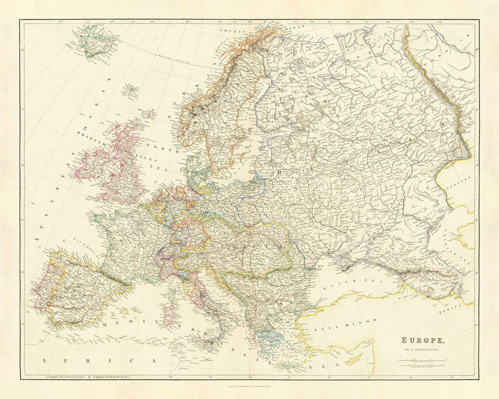 El "Europa" de John Arrowsmith es más que un mapa; es un testimonio del arte de la cartografía, un registro histórico y una obra de arte. Su detallada representación del paisaje político y físico de Europa, su contexto histórico y la hábil cartografía de Arrowsmith lo convierten en una valiosa adición a cualquier colección. Ya sea para un historiador que busca información sobre el pasado, un geógrafo que estudia las características físicas del continente, o un entusiasta del arte que aprecia la belleza de la cartografía, este mapa ofrece algo para todos.