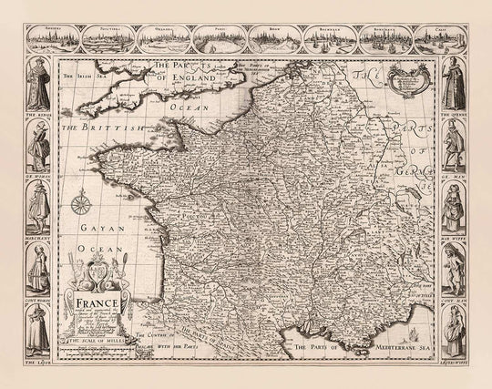 Alrededor del borde del mapa hay algunas maravillosas grabados de ciudades francesas como Calais, París, Burdeos y Poitiers - y también dibujos de la gente francesa, incluyendo al Rey, la Reina, 'Caballero' y 'Mercader'.