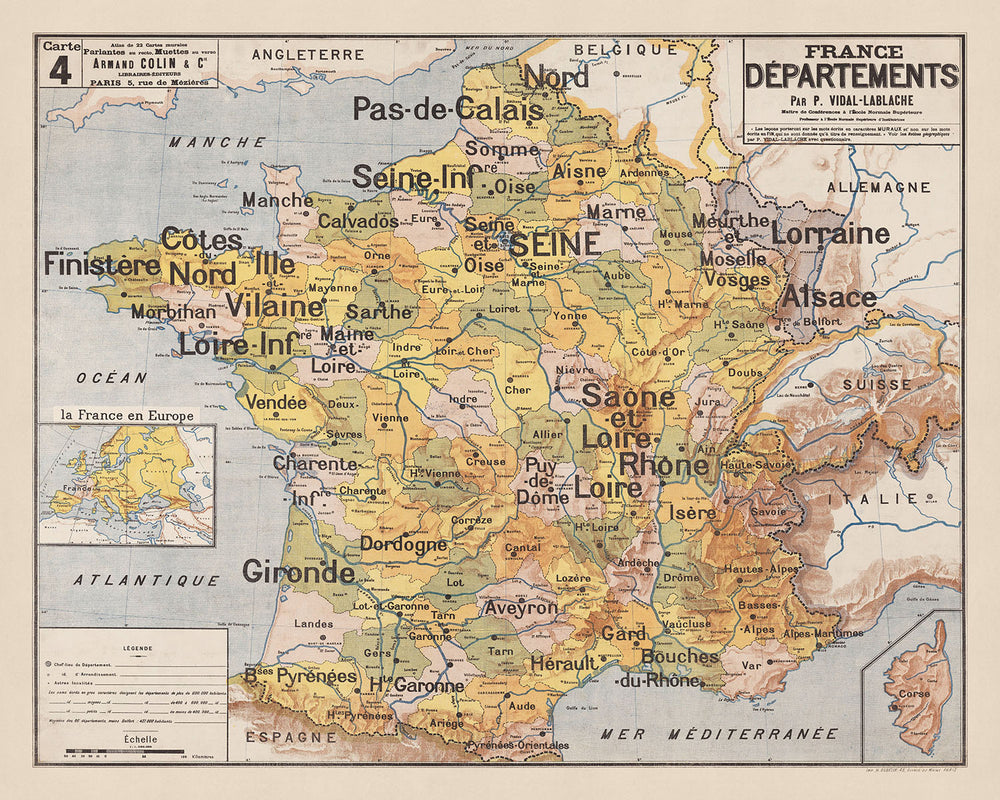 Poseer el mapa "Francia: Departamentos" es más que la adquisición de un artefacto raro; es una invitación a viajar por el corazón de Francia, guiado por uno de los geógrafos más influyentes del siglo XIX. Es una pieza que no sólo adorna un espacio con su exquisito detalle y artesanía, sino que también sirve como un puente hacia el pasado, ofreciendo información sobre los contornos geográficos e históricos que han dado forma a Francia. Este mapa es una celebración de la identidad francesa, un tributo a su resiliencia y un testimonio del legado perdurable de las contribuciones académicas de Paul Vidal de La Blache.