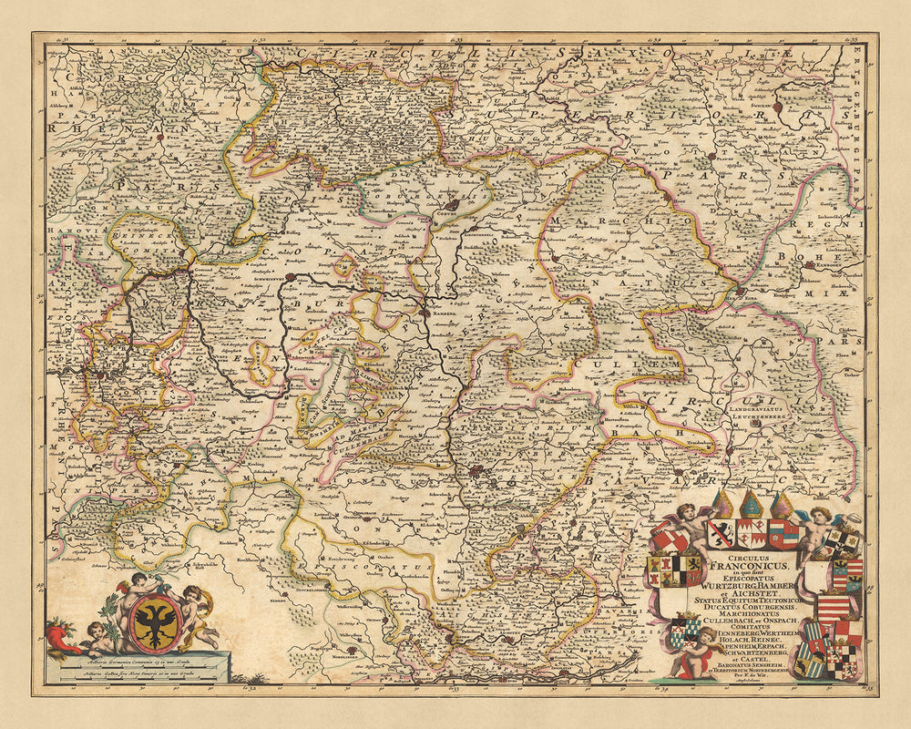 Este exquisito mapa, 'Circulus Franconicus: in quo sunt Episcopatus Wurtzburg, Bamberg et Aichstet', o en inglés, 'Franconian Circle: en el que se encuentran los obispados de Würzburg, Bamberg y Eichstätt', ofrece una visión fascinante del panorama político y geográfico. de la Alemania de finales del siglo XVII. Elaborado por Nicolaes Visscher II en 1690, el mapa representa vívidamente el Círculo de Franconia, una división clave dentro del Sacro Imperio Romano Germánico, que hoy corresponde a gran parte de la Alemania moderna.
