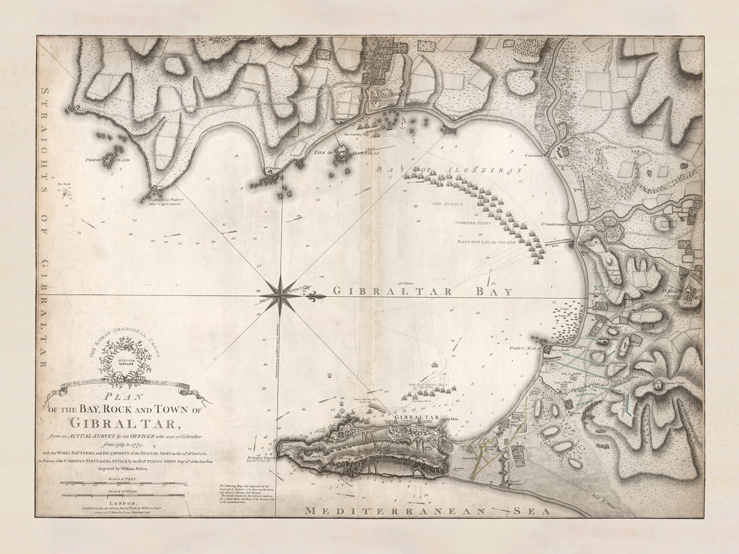 Mapa antiguo de Gibraltar de William Faden, 1775: Puerto de Gibraltar, Bahía Catalana, Punta Europa, Peñón de Gibraltar, Jardines de la Alameda