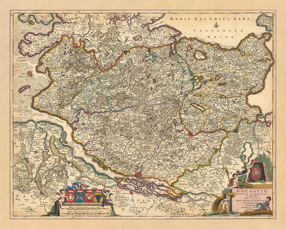 Además de estas ciudades, el mapa también describe las divisiones políticas de la época, lo que permite vislumbrar la estructura administrativa de finales del siglo XVII. Los ducados de Holstein, Dithmarschen, Stormarn y Wagria están claramente demarcados, lo que ofrece una idea de la dinámica regional de la época. Las fronteras, ciudades y puntos de referencia están dibujados de forma intrincada, lo que refleja la atención de Visscher al detalle y el compromiso con la precisión.