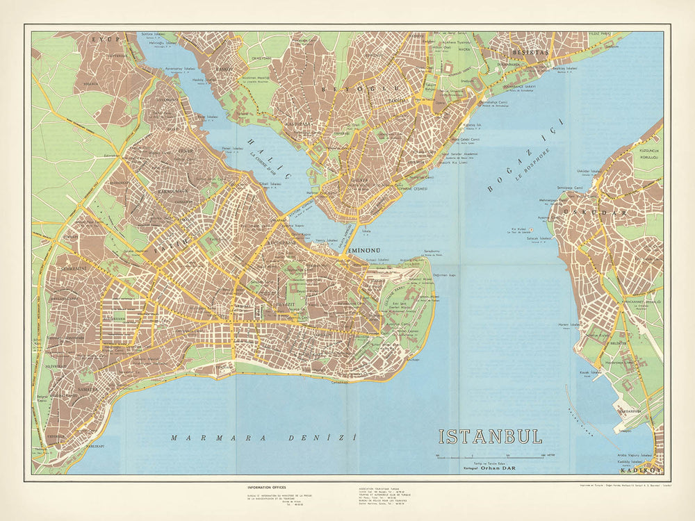 Descubre el cautivador atractivo de Estambul a través del "Mapa de Calles de Estambul", una notable obra cartográfica de la década de 1960. Elaborado por el estimado Ministerio de Prensa-Publicación y Turismo, este mapa captura una era transformadora en la rica historia de Estambul. Muestra el vibrante paisaje urbano de la ciudad durante un período de rápido desarrollo, influenciado por la Ley de Fomento de la Industria Turística de 1953. Esta ley desempeñó un papel fundamental en la formación de la identidad moderna de la ciudad, eximiendo a los inversores de impuestos y fomentando una floreciente industria turística.
