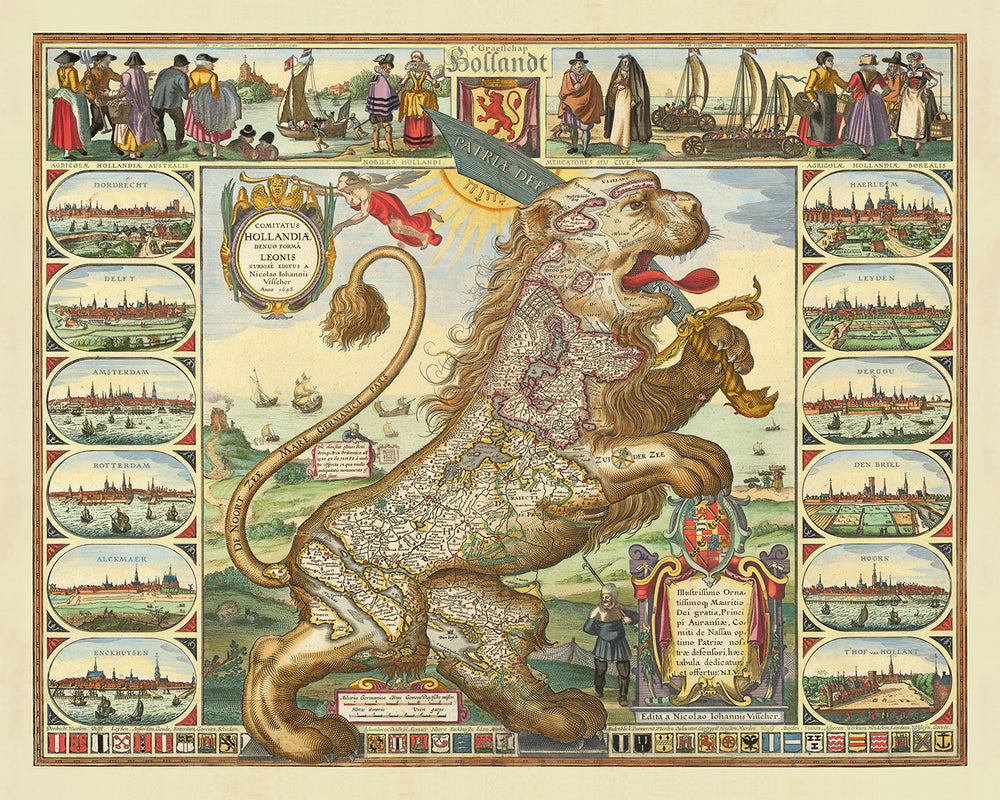 Este hermoso mapa antiguo de los Países Bajos, también conocido como Leo Belgicus, fue creado por Claes Janszoon Visscher en 1648. El mapa tiene forma de león, con la cabeza en Ámsterdam y la cola en Luxemburgo. Los cinco lugares más importantes que se muestran en el mapa son Ámsterdam, Rotterdam, Amberes, Bruselas y Gante.