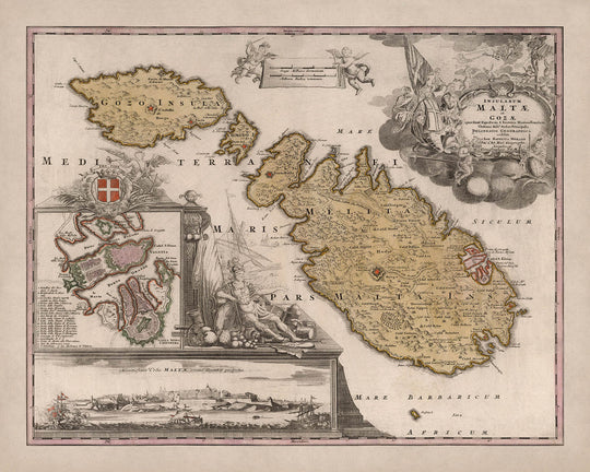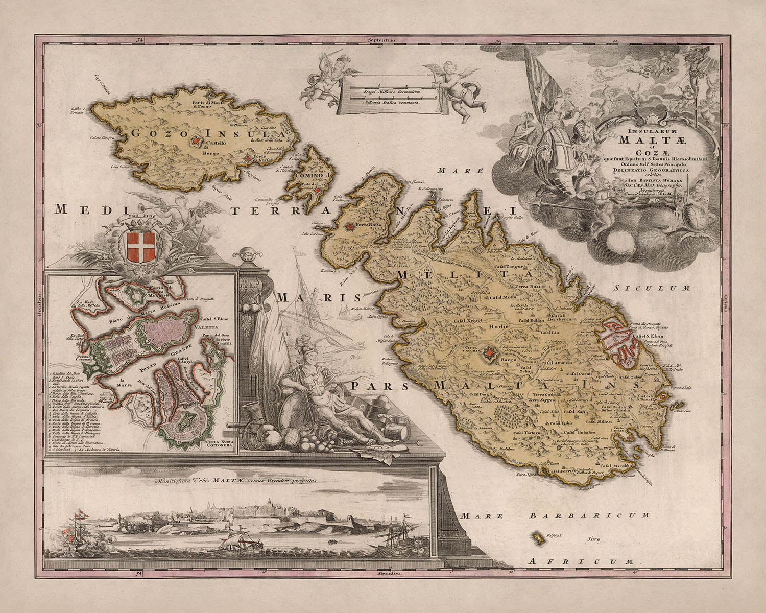 Los elementos artísticos del mapa son tan cautivadores como sus detalles geográficos. El cartucho decorativo, adornado con figuras alegóricas, añade una capa de sofisticación artística. Estas ilustraciones, junto con la representación de temas navales, enriquecen la narrativa del mapa, ofreciendo perspectivas sobre el contexto cultural e histórico de la época. La inclusión del escudo de armas de Malta enfatiza aún más la identidad y la importancia de la isla.