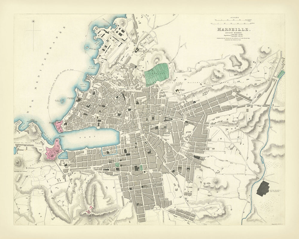 El mapa de "Marsella", elaborado por la prestigiosa Sociedad para la Difusión de Conocimientos Útiles (SDUK) en 1870, es una ventana fascinante al paisaje urbano histórico de una de las ciudades portuarias más importantes de Francia. Este mapa antiguo es famoso por su meticuloso detalle y su calidad excepcional, lo que lo convierte en una de las mejores representaciones de Marsella publicadas en un atlas comercial durante el siglo XIX. Captura vívidamente el intrincado trazado de las calles, los puntos de referencia clave y las características topográficas, ofreciendo una visión fascinante del pasado de la ciudad.