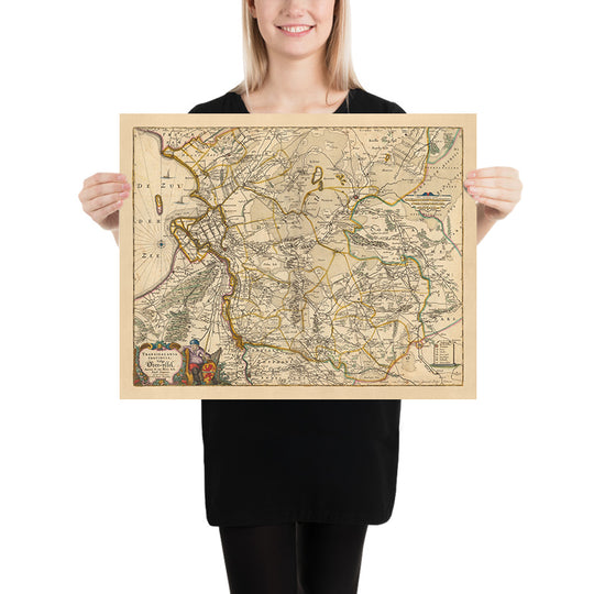 El mapa destaca las ciudades de Zwolle, Kampen, Hengelo, Deventer y Enschede. Cada ciudad está representada con notable precisión, sus ubicaciones y la topografía circundante ilustradas con precisión. Más allá de las ciudades, el mapa también muestra límites administrativos, carreteras, vías fluviales, bosques, lagos y puntos de referencia, proporcionando una visión general completa de las divisiones geográficas y políticas de la provincia.
