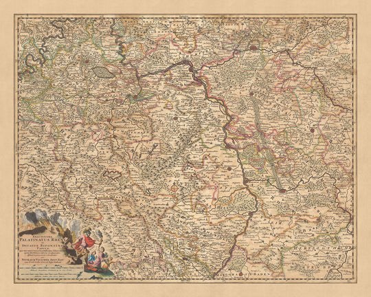 El mapa destaca cinco ciudades importantes de la época: Frankfurt, Mannheim, Saarbrücken, Mainz y Darmstadt. Cada ciudad está representada de manera intrincada, lo que ofrece una idea de su importancia histórica. Frankfurt, una ciudad clave para el comercio internacional, está bellamente ilustrada, al igual que Mannheim, un bastión del Palatinado. Saarbrücken, Mainz y Darmstadt también están cuidadosamente representados, destacando su papel en el complejo panorama político de la época.
