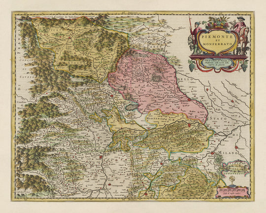 Piamonte y Monferrato, una región del noroeste de Italia, están representados en este hermoso mapa coloreado a mano de 1665. El mapa, creado por el renombrado cartógrafo holandés Joan Blaeu, muestra la rica historia y geografía de la región.