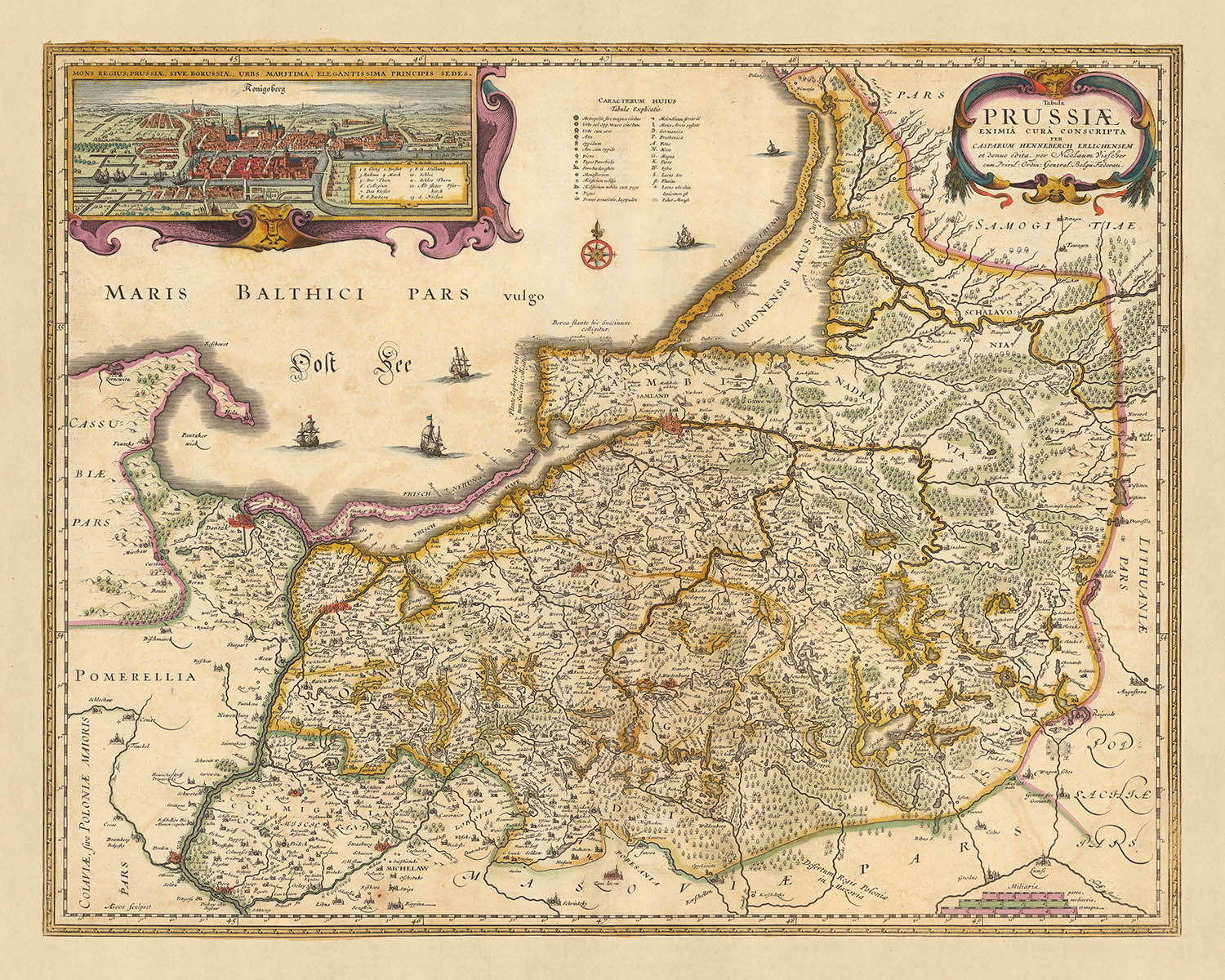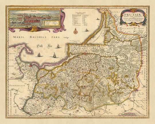 El mapa, en latín, se traduce como "Mapa de Prusia, con una ilustración insertada de la ciudad de Konigsberg". Ofrece una gran cantidad de información sobre las divisiones políticas y regiones de la época. El mapa se centra en Prusia y ofrece una visión intrigante del paisaje geopolítico del siglo XVII.