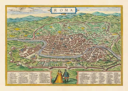 Publicado en 1572 por Georg Braun y Frans Hogenberg, este es el mapa completo más antiguo de Roma visto desde arriba. Si Shakespeare alguna vez visitó Roma, así es como habría lucido. Este mapa fue publicado por primera vez en Civitates Orbis Terrarum - las Ciudades del Mundo - que fue una obra maestra cartográfica con 546 mapas.