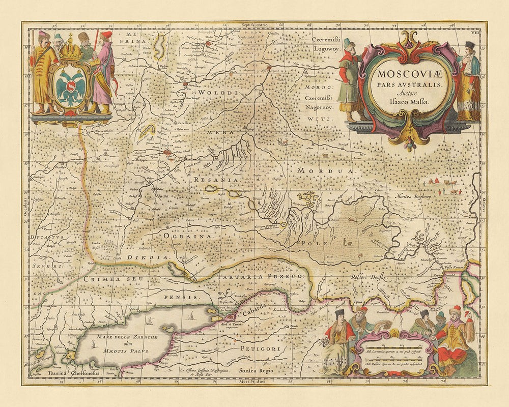 Adéntrese en el pasado con el mapa 'Moscoviae, Pars Australis', una exquisita cartografía de Nicolaes Visscher II, que data de 1690. Este mapa, cuyo título se traduce como 'Parte Sur de Moscovia' en inglés, ofrece una vista detallada de El sur de Rusia, que revela no sólo la geografía, sino también el panorama histórico y político de la época.