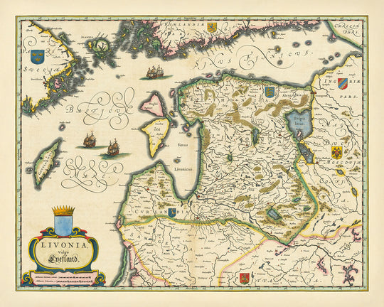 Históricamente, el mapa "Livonia vulgo Lyefland" es un valioso artefacto que captura las dinámicas geopolíticas del siglo XVII. Refleja las intrincadas fronteras y límites políticos de la época, marcados con líneas de colores que delinean los territorios de varios estados y regiones. Los escudos de armas y símbolos heráldicos ofrecen un vistazo a las familias nobles y entidades políticas que ejercieron poder en la región báltica. Este mapa no es solo una obra de arte; es un documento histórico que ofrece una profunda comprensión del pasado, convirtiéndolo en una valiosa adición a cualquier colección de mapas antiguos.