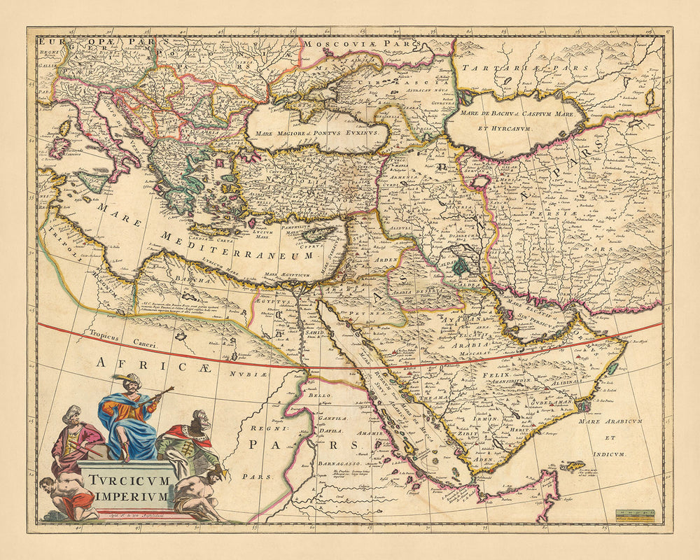 Contempla la majestuosidad de 'Turcicum imperium', un cautivador mapa histórico que te transporta a la extensión del Imperio Otomano a finales del siglo XVII. Elaborado por el estimado Nicolaes Visscher II, este mapa es un testimonio de las excepcionales habilidades cartográficas de la Edad de Oro holandesa. El nieto de Claes Janszoon Visscher, uno de los mejores cartógrafos de su tiempo, Nicolaes Visscher II, imbuyó en este mapa la atención al detalle y la precisión características de su linaje. Traducido como "El Imperio Turco", este mapa resume los vastos territorios del Imperio Otomano, que se extienden desde Oriente Medio hasta el sur de Europa y el noreste de África.