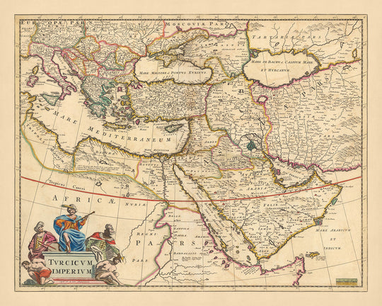 El 'Turcicum imperium' no es simplemente un mapa, sino un lienzo vibrante que pinta una imagen vívida del mundo tal como se conocía en 1690. Muestra importantes ciudades, regiones y lugares emblemáticos de la época, desde el bullicioso mar Mediterráneo hasta el tranquilo Mar Rojo. La complejidad del mapa se extiende a la representación de fronteras políticas y administrativas, vías fluviales, canales e incluso puntos de referencia. Da vida a la grandeza del Imperio Otomano, que se extiende al norte hasta Hungría y Circasia, al este hasta Persia y abarca toda la Península Arábiga.