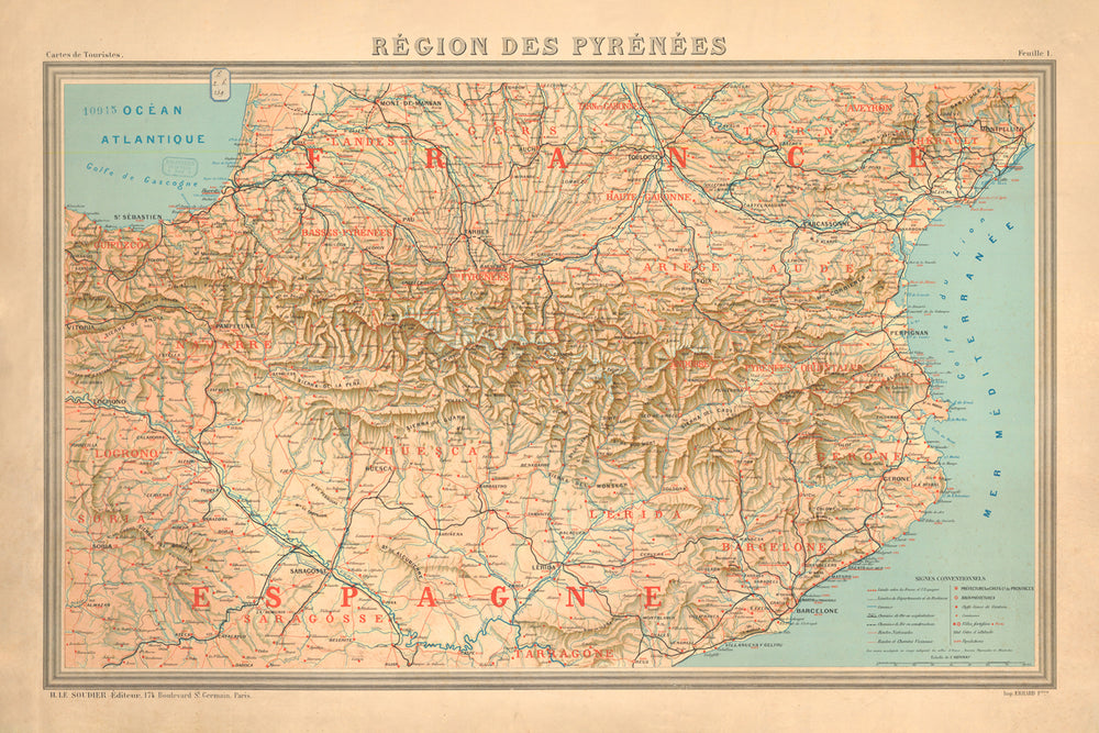 Este mapa bellamente detallado del sur de Francia y el norte de España es un tesoro de información para historiadores, geógrafos y cualquier persona interesada en la región. Creado originalmente en 1920 por un cartógrafo anónimo, este mapa ofrece una perspectiva única de una región que ha sido testigo de siglos de conflictos y cambios.
