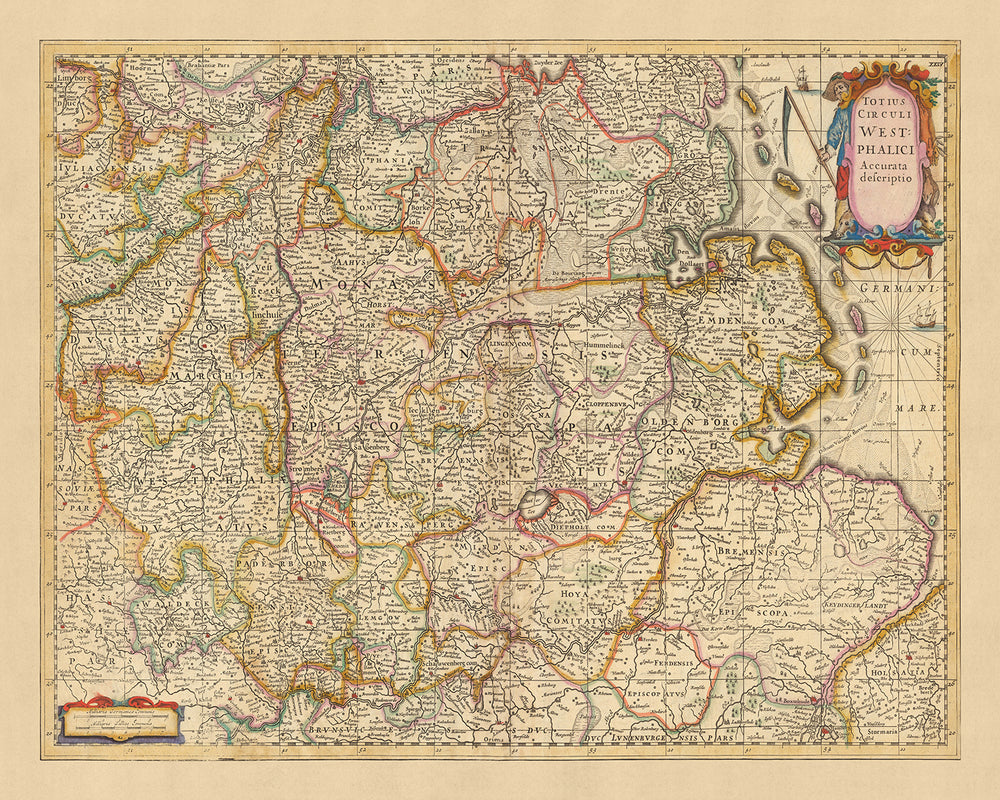 Más allá de las ciudades, el mapa también ofrece una visión más amplia del Círculo de Westfalia, una región importante dentro del Sacro Imperio Romano. El Círculo de Westfalia comprendía varios territorios, cada uno con su contexto político e histórico único. Por lo tanto, este mapa sirve como una ventana al pasado, revelando la intrincada dinámica de esta región durante un período crucial en la historia europea.