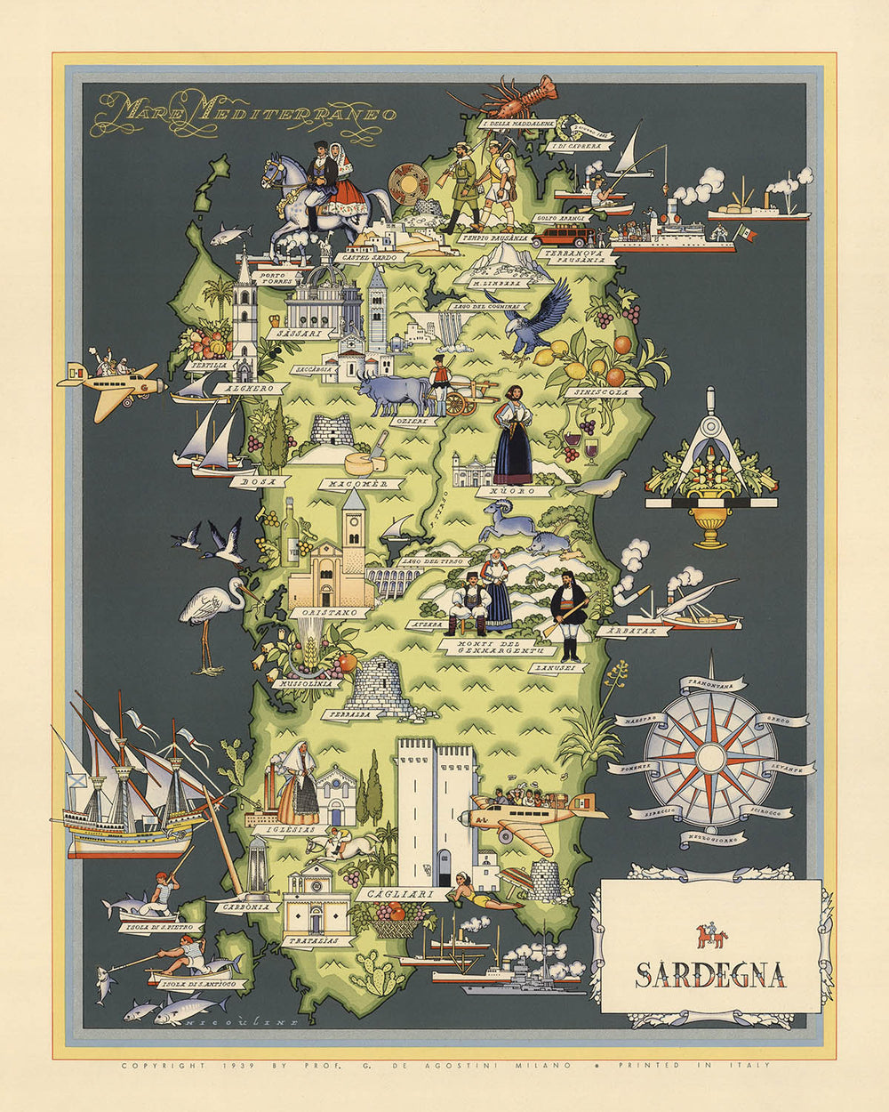 Antigua Mapa Pictórico de Cerdeña por De Agostini, 1938: Cagliari, Sassari, Nuoro, Oristano, Olbia