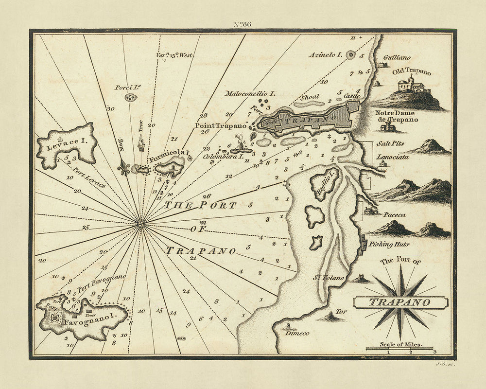 El mapa de Heather es mucho más que una simple guía; es un rico tapiz de geografía local y actividad humana. Marca meticulosamente las salinas y las cabañas de pescadores que eran integrales para la economía local de Trapani, junto a características más monumentales como la Torre di Ligny y el Lazzaretto di Trapani. Cada una de estas características no es solo un punto en un mapa, sino una puerta de entrada a las vidas diarias de aquellos que vivieron y trabajaron en Trapani a principios de 1800. La inclusión de tales detalles ofrece una vívida visión de las condiciones socioeconómicas de la época, haciendo de este mapa un recurso valioso tanto para navegantes como para historiadores.