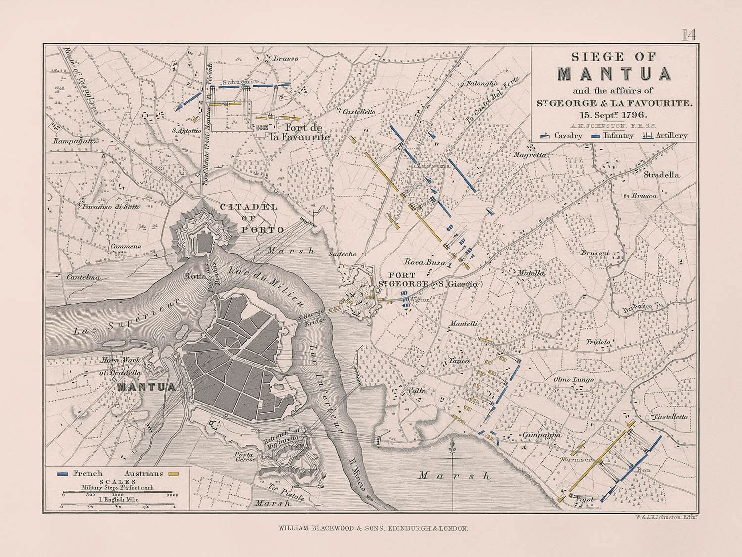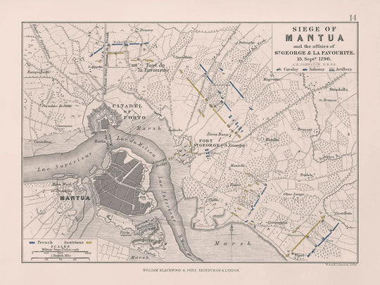 Introduce la cautivadora obra titulada "Asedio de Mantua y los asuntos de San Jorge & La Favourite," magistralmente creada por A.K. Johnston en 1796. Esta notable pieza ofrece un mapa ilustrado detallado que muestra el significativo enfrentamiento militar entre las fuerzas francesas y austriacas durante el asedio de Mantua, un episodio crucial en la Guerra de la Primera Coalición.