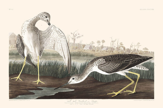 El "Godwit revelador, o Aguja" es una ilustración ejemplar conocida por su atención al detalle y su sofisticada representación del ave, también conocida científicamente como Tetanus melanoleucus. Esta obra refleja la peculiaridad y el sutil encanto del ave, capturando sus tonos terrosos y grisáceos familiares que se mezclan con vibrantes toques de plumaje dorado. La elección de colores de Audubon y la postura dinámica del ave destacan su distintivo grito y naturaleza locuaz a través de la quietud del arte.