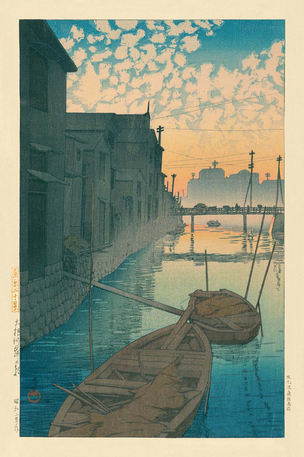 El amanecer en la ribera del río Daikon Gashi de Hasui Kawase, creado en 1935, ofrece un vistazo sereno a la belleza tranquila que caracteriza las veneradas impresiones en madera del artista. Kawase, una figura clave en el movimiento Shin-Hanga, es celebrado por su habilidad para combinar técnicas tradicionales japonesas de ukiyo-e con influencias artísticas occidentales, resultando en paisajes evocadores y contemplativos.