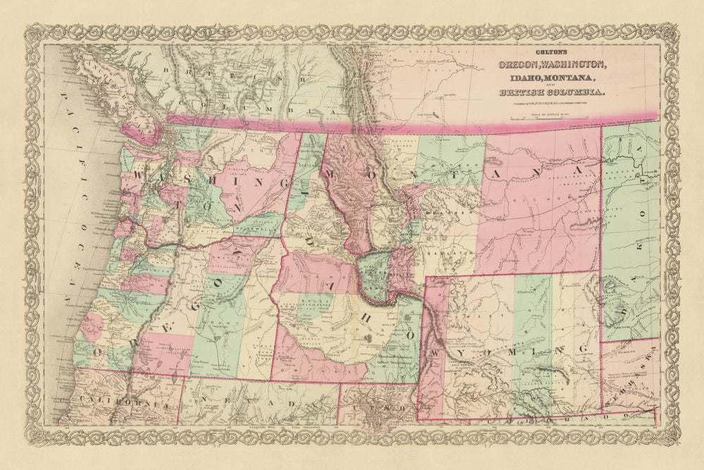 Antiguo mapa del noroeste del Pacífico por JH Colton, 1868: Portland, Seattle, Boise, Helena, Cheyenne