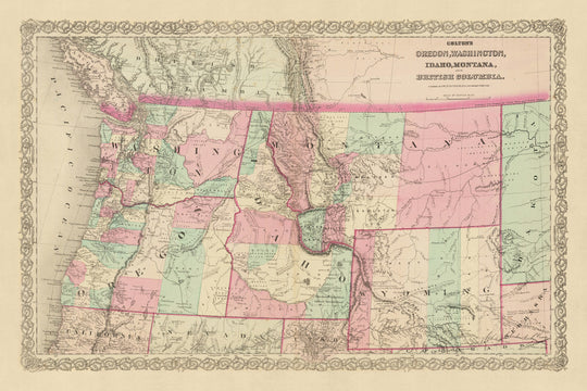 Este mapa, un trabajo meticuloso del renombrado JH Colton, ofrece una instantánea esclarecedora del noroeste del Pacífico durante este momento crucial. Colton, ampliamente considerado como el mejor cartógrafo estadounidense de su época, tiene una capacidad inigualable para transmitir tanto la precisión geográfica como el espíritu de la época. Sus representaciones no son meros bocetos, sino historias de una nación floreciente, su paisaje y su ambición.