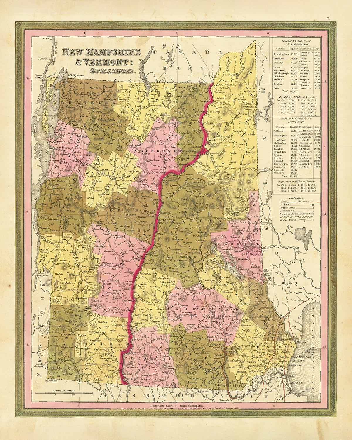 Retroceda en el tiempo y viva una experiencia única de la historia de Estados Unidos con este auténtico mapa de 1840 de New Hampshire y Vermont, obra del famoso cartógrafo H. S. Tanner. Esta exquisita pieza es algo más que un mapa: es una ventana a una época pasada, que muestra pueblos, ciudades y asentamientos anteriores a muchas de las metrópolis modernas de la región. Dibujado a mano con una precisión y artesanía sin parangón, el mapa permite rastrear las raíces de las ciudades que hoy conoces hasta sus nombres fundacionales, ofreciendo una mezcla única de contexto histórico y atractivo visual.