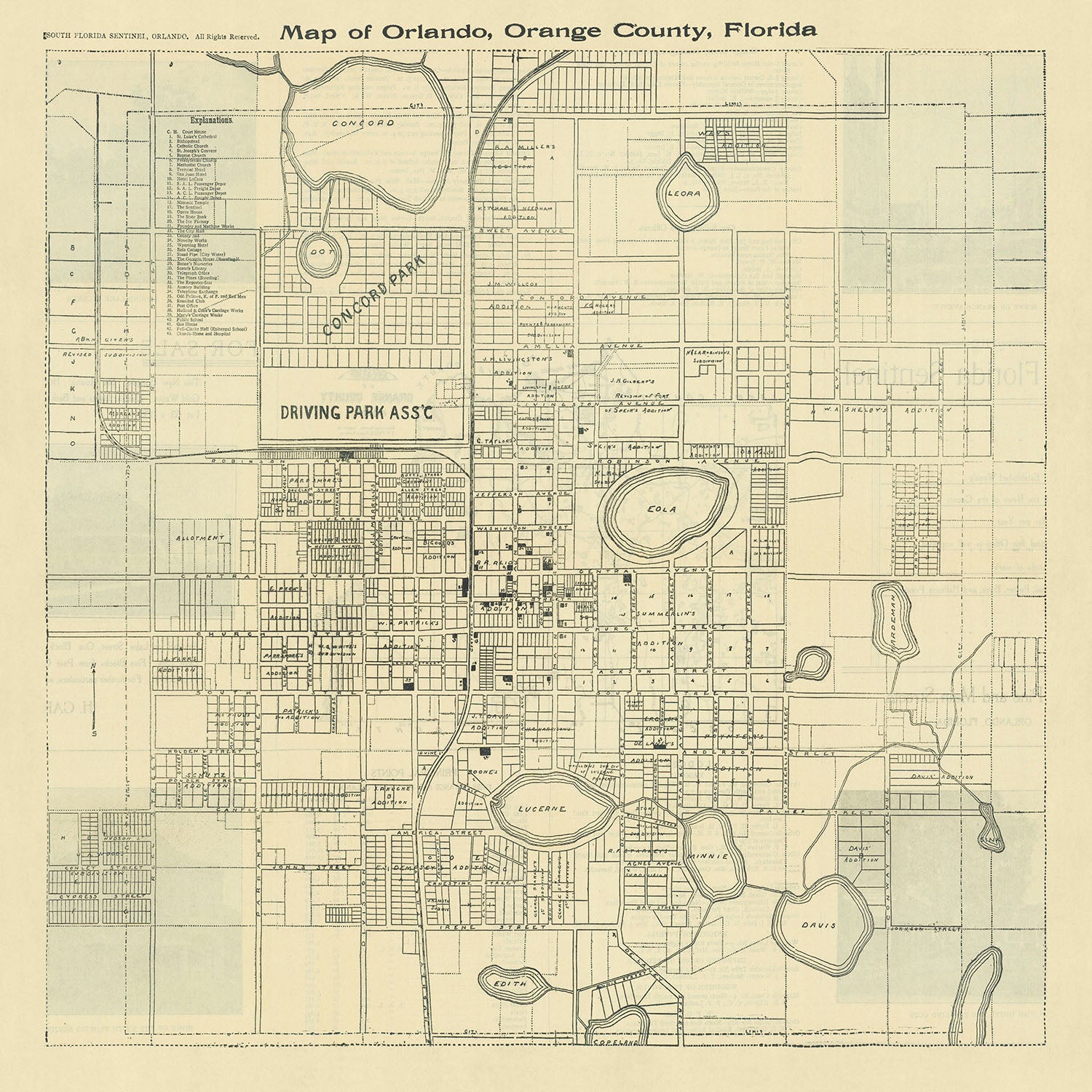 Orlando, entonces una ciudad pequeña pero en rápido crecimiento, es el enfoque central del mapa. El sistema de cuadrícula de calles, una característica definitoria de las ciudades estadounidenses, es evidente, con calles numeradas que corren de norte a sur y calles nombradas que corren de este a oeste. Las principales vías de la ciudad, como Orange Avenue y Central Avenue, se muestran de manera prominente, destacando su importancia como corredores comerciales y de transporte.