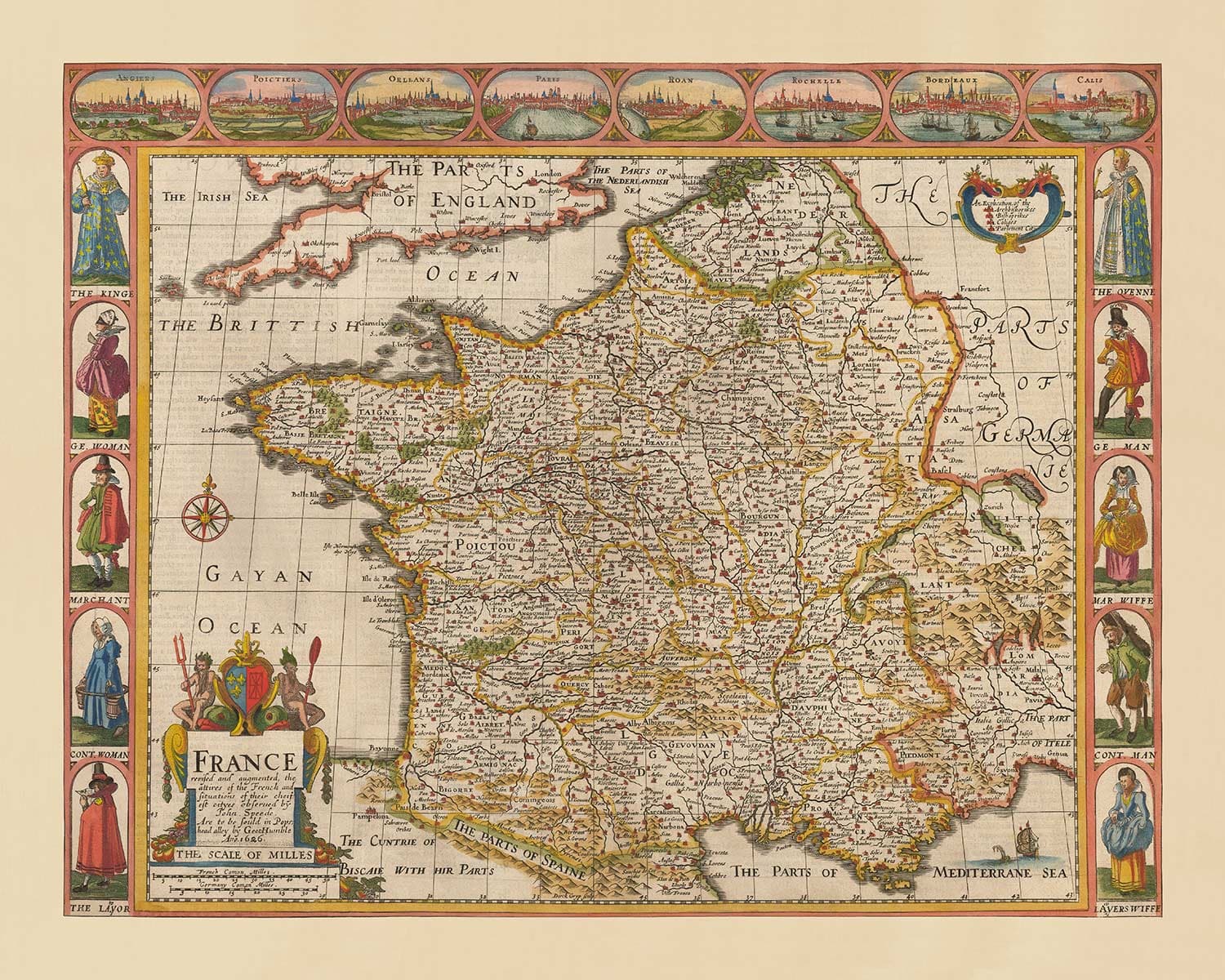 Alrededor del borde del mapa hay algunas maravillosas grabados de ciudades francesas como Calais, París, Burdeos y Poitiers - y también dibujos de la gente francesa, incluyendo al Rey, la Reina, 'Caballero' y 'Mercader'.