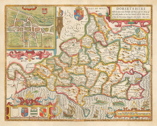 Muchos de los pueblos, aldeas y ciudades en Dorset ya son visibles en este mapa. En la parte superior izquierda hay un grabado detallado de Dorchester, la capital/ciudad del condado de Dorset.
