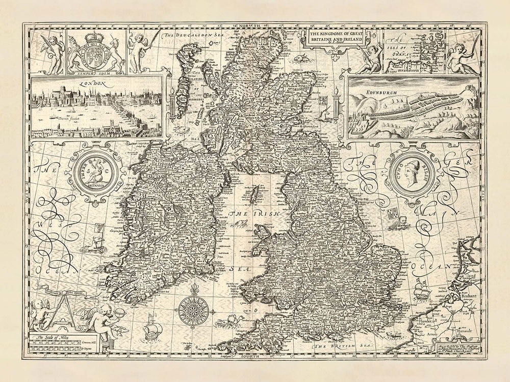 Los cartuchos decorativos, símbolos heráldicos e ilustraciones in situ añaden al atractivo del mapa, proporcionando un festín visual para los ojos. La inclusión de vistas de Londres y Edimburgo, junto con un mapa de las Islas Orcadas, enriquece la narrativa, ofreciendo un vistazo a los hitos arquitectónicos y culturales de la época. Los elementos artísticos del mapa, como barcos y monstruos marinos adornando las aguas circundantes, evocan un sentido de aventura y exploración, característico del período.