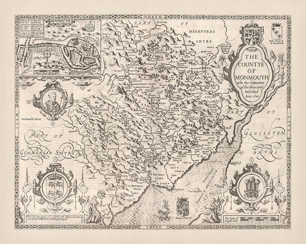 Mapa antiguo de Monmouthshire realizado por Speed, 1610: Monmouth, Abergavenny, Chepstow, Newport, Usk