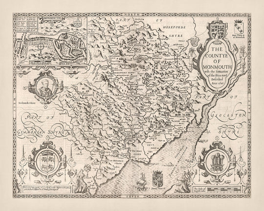 "El Condado de Monmouth," elaborado por el estimado cartógrafo inglés John Speed en 1610, es una ventana cautivadora al pasado, que muestra el intrincado paisaje político y físico de Monmouthshire durante principios del siglo XVII. Este mapa, parte de los renombrados atlas de Speed "El Teatro del Imperio de Gran Bretaña" y "Una Perspectiva de las Partes Más Famosas del Mundo," es un testimonio de su meticulosa atención al detalle y su profundo entendimiento de la geografía. El mapa no solo delimita los límites y características topográficas de Monmouthshire, sino que también ofrece un vistazo a las divisiones administrativas y el rico tapiz histórico de la región.