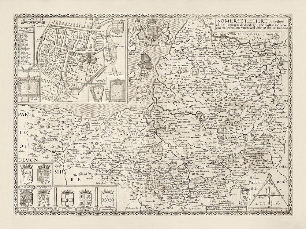 Muchos de los pueblos, aldeas y ciudades en Somerset ya son visibles en este mapa. En la esquina superior derecha hay un grabado detallado de Bath, que entonces (y aún) era la capital de este antiguo condado.