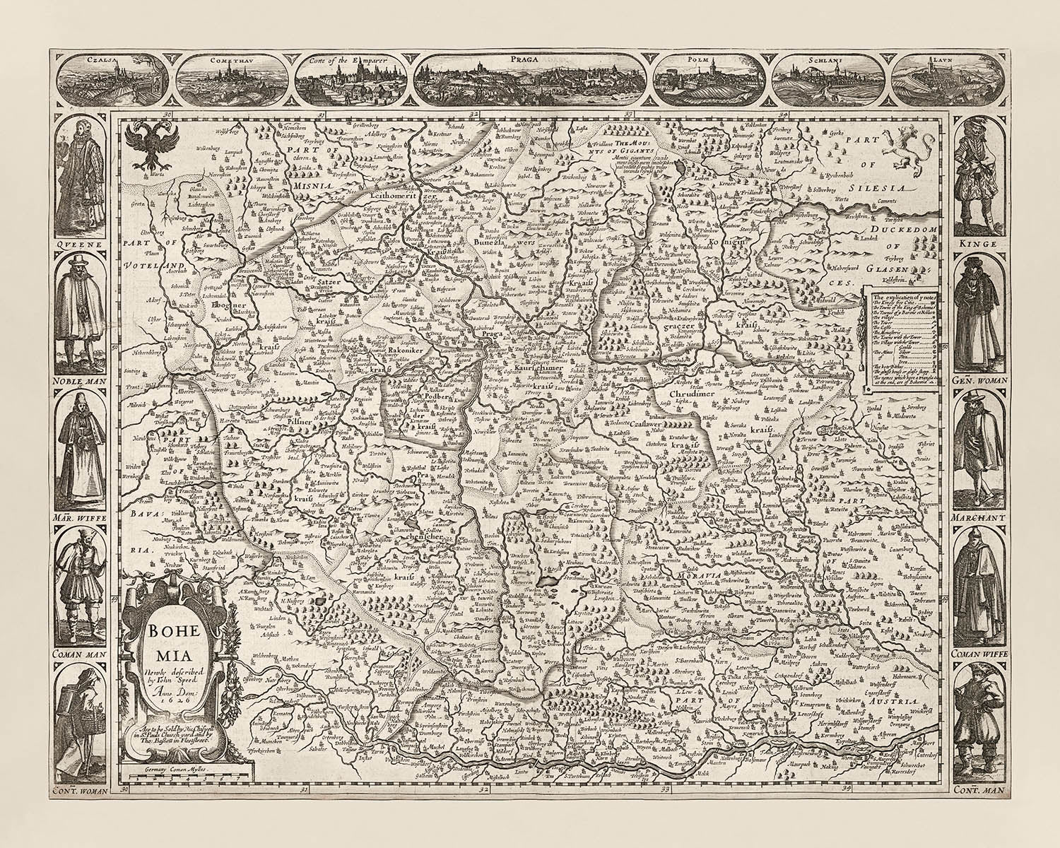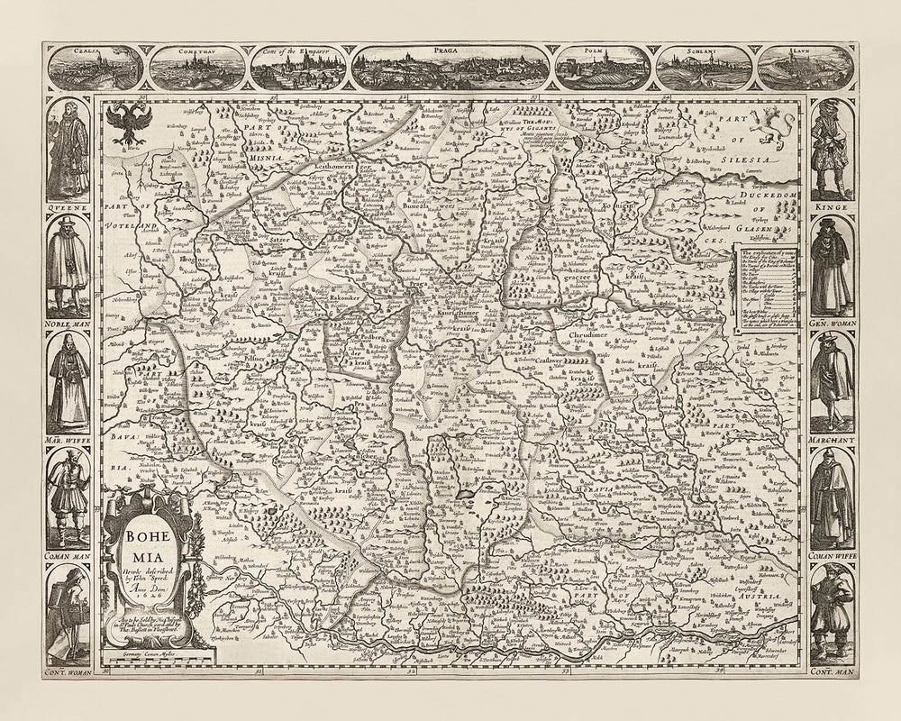 El mapa está adornado con elementos decorativos que realzan su atractivo visual y su valor histórico. A lo largo de los bordes, las figuras con atuendos tradicionales añaden un toque de elegancia y autenticidad, ofreciendo una ventana al tejido cultural de la Bohemia del siglo XVII. El diseño del mapa se enriquece aún más con un cartucho decorativo, que muestra el talento artístico de Speed y su compromiso de crear una pieza visualmente impactante. Estos adornos, combinados con las características geográficas detalladas, hacen de este mapa una verdadera obra de arte.