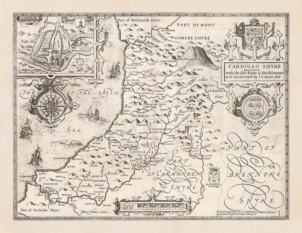 Antiguo mapa monocromo de Ceredigion, Gales, 1611 por John Speed: Aberystwyth, Cardigan, Aberporth, Aberarth