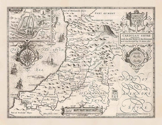 Este antiguo mapa monocromático y maravilloso muestra el antiguo condado de Cardiganshire (ahora Ceredigion), Gales en 1611. Fue creado por John Speed y grabado por Jodocus Hondius, y publicado originalmente en "El Teatro del Imperio de Gran Bretaña" de Speed.