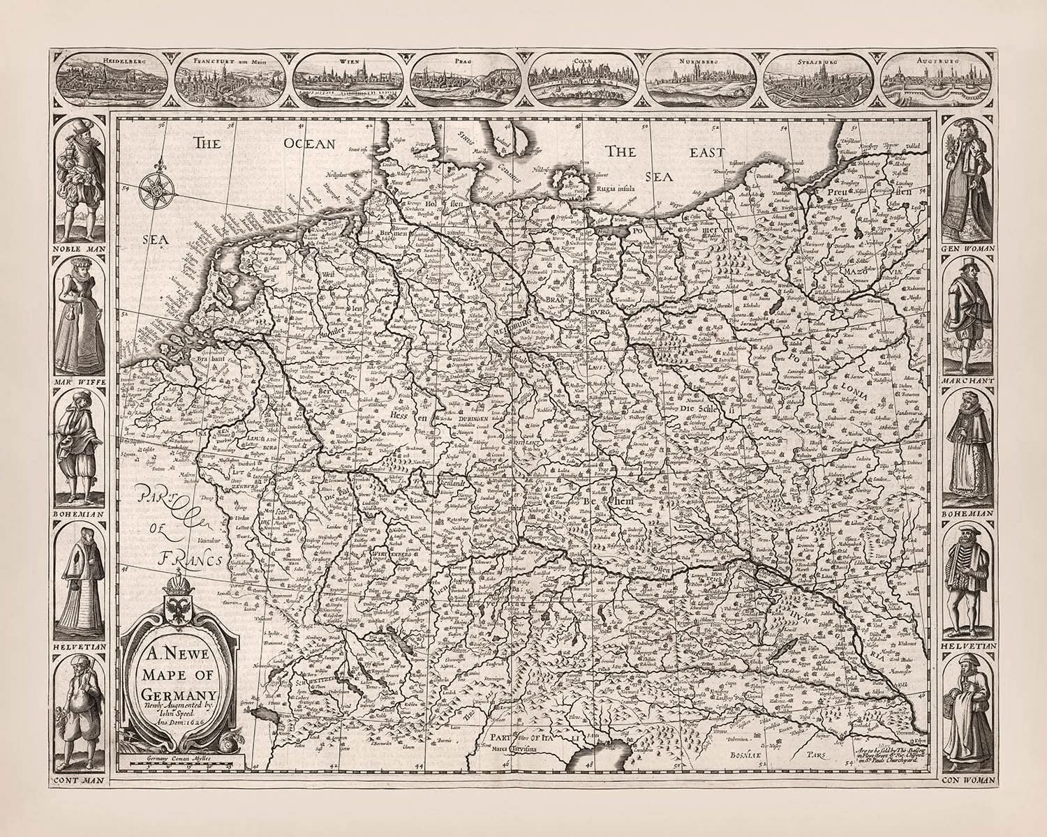 Antigua mapa monocromo de Alemania por Speed, 1626: Berlín, Hamburgo, Múnich, Mar del Norte, Mar Báltico
