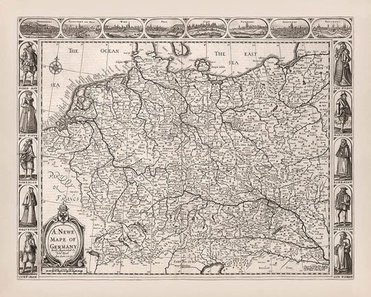 Adéntrese en el fascinante mundo de la cartografía del siglo XVII con "Un nuevo mapa de Alemania", elaborado por el famoso cartógrafo inglés John Speed en 1626. Este exquisito mapa ofrece una visión del paisaje político y físico de Alemania tal como se entendía durante el período moderno temprano. La meticulosa atención a los detalles y el talento artístico de Speed hacen de este mapa no solo un documento geográfico sino también una obra de arte. El mapa está adornado con ilustraciones de figuras con atuendos tradicionales, lo que añade una riqueza cultural que transporta al espectador al pasado.