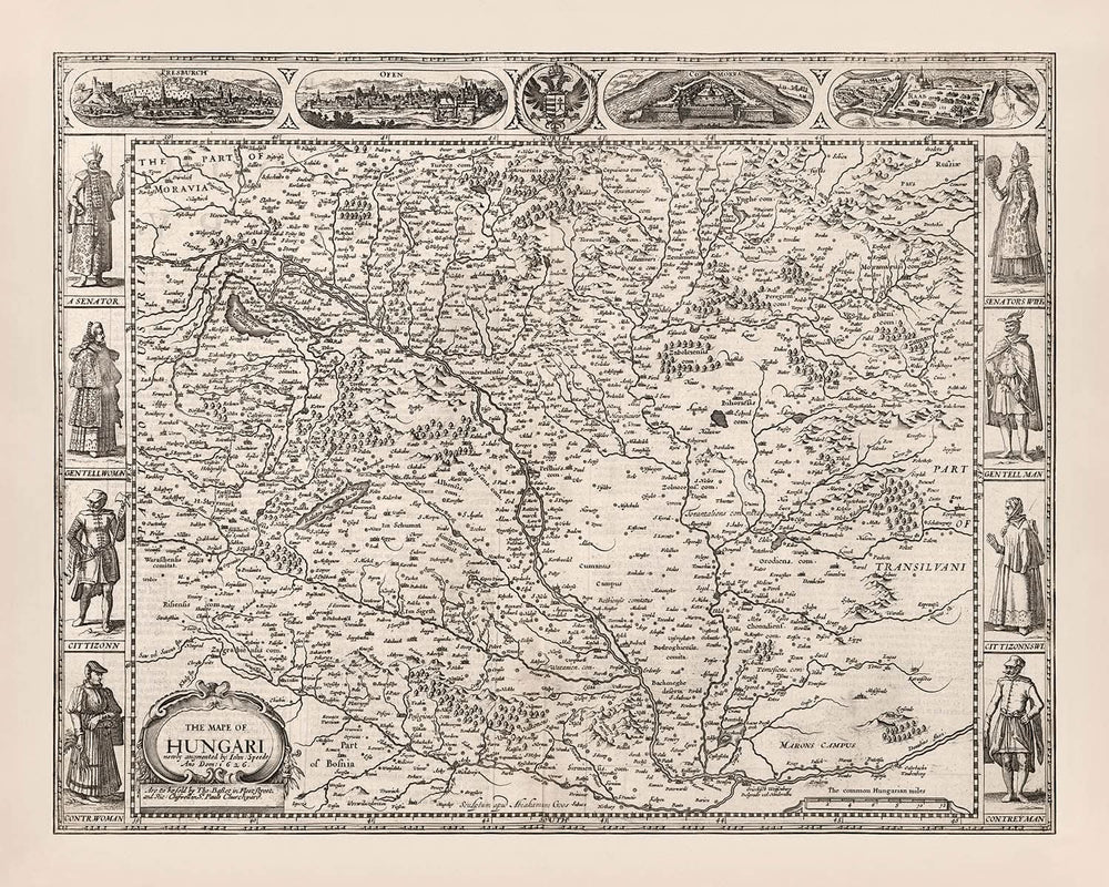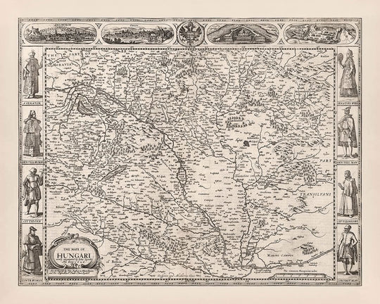 Este mapa ilustra vívidamente las regiones de Hungría, Moravia, Transilvania y Bohemia, capturando la esencia de estas áreas con una precisión notable. Los límites políticos están cuidadosamente delineados, lo que proporciona una idea del paisaje geopolítico de la época. El relieve está representado ingeniosamente a través de bocetos, destacando la diversa topografía que define esta parte de Europa. La atención de Speed al detalle se extiende a las intrincadas ilustraciones de figuras locales con atuendos tradicionales, agregando una dimensión cultural a la representación geográfica.